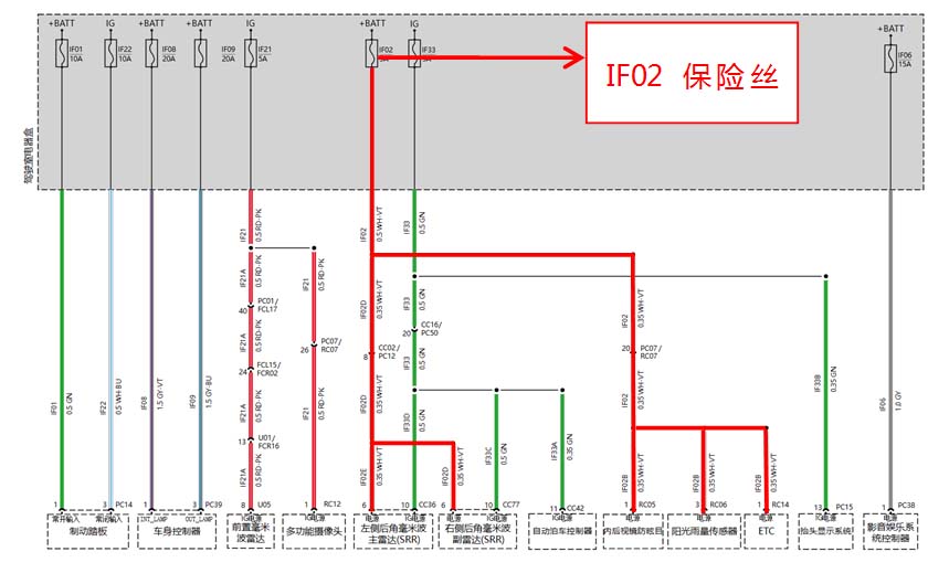 5.查阅维修手册IF02给雨量传感器,nfc模块,内后视镜,左右后毫米波雷达,ETC模块供电,分别检查以上各个模块的插头及线路未发现异常,于是分别断开每一个模块进行验证,当断开左后侧毫米波雷达后反复试车保险丝没有再熔断。