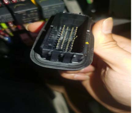 确认为CC04号线插头异常,于是扒开这个插头发现18号针脚有弯曲。将针脚扳正,复原插头,试车后视镜记忆功能正常。