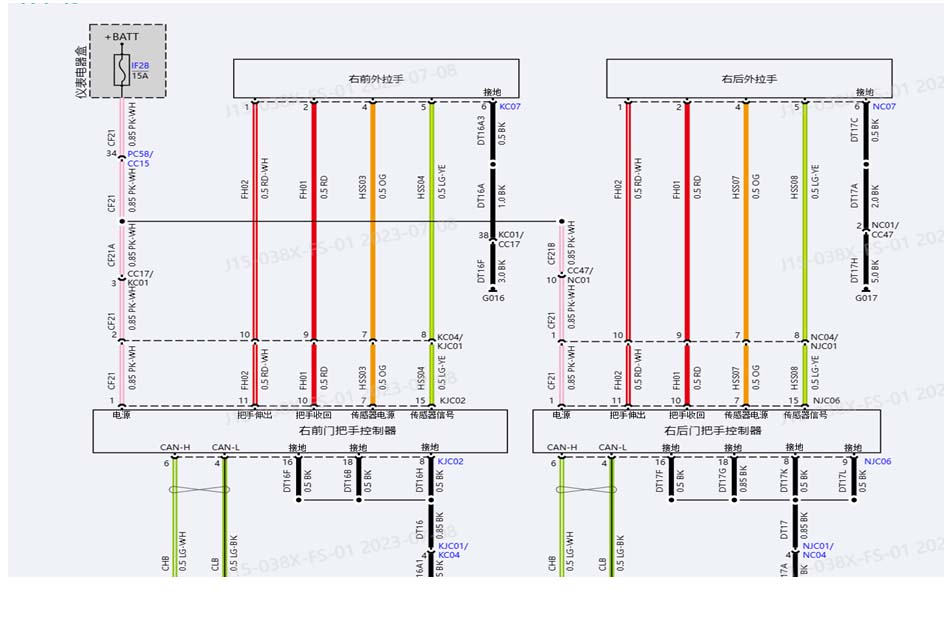 3.根据电路图查看为外拉手供电,接地,控制模块故障。