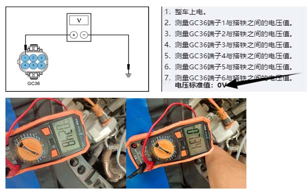 备注:2.3号针脚与搭铁电压7.3V左右、1.4.5.6 号针脚与搭铁电压2.5V左右 同款车对比电压值: 1.4.5.6 号针脚与搭铁电压为2.5V左右 2.3号针脚与搭铁电压7.3V左右 (维修手册标准电压值与实际测量电压值不符,已实车测量为准)