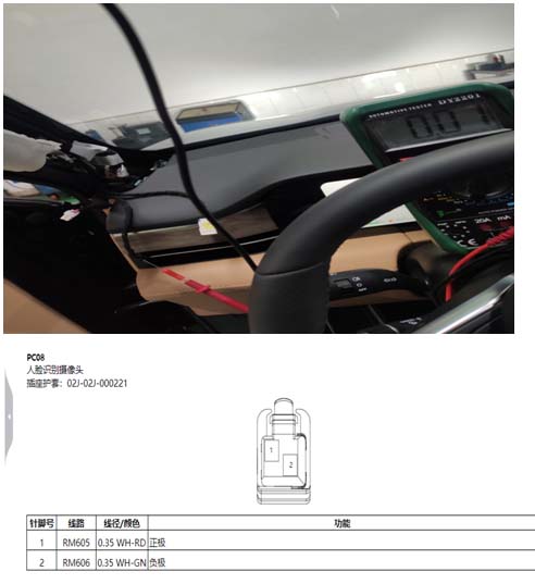 确定软件上没有问题,故障点怀疑在硬件上,与试驾车对换人脸识别摄像头,对换后故障依旧,说明与摄像头没有关系,决定测量线路找到人脸识别摄像头插座PC08根据电路图测量该插座两根线的电压如图
