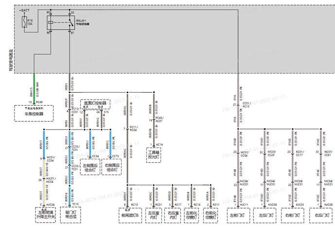 案例总结:右后组合灯破损遇下雨天进水短路导致IF16号保险丝保护熔断,导致升降机,氛围灯等电器元件没有供电不工作。
