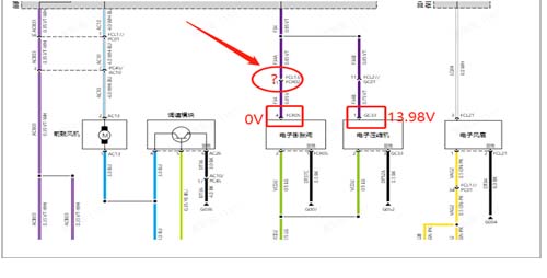 3 排查到电子膨胀阀电源异常。由空调系统电路图得知电子膨胀阀与压缩机共用电源,进而锁定新的切入点FCR02转接插件处,为排查过程指明方向。