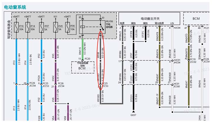 4、测量确认继电器30号针脚电压14V正常,87号端子飞线到PC25插头3号段子后主驾控制开关恢复正常。