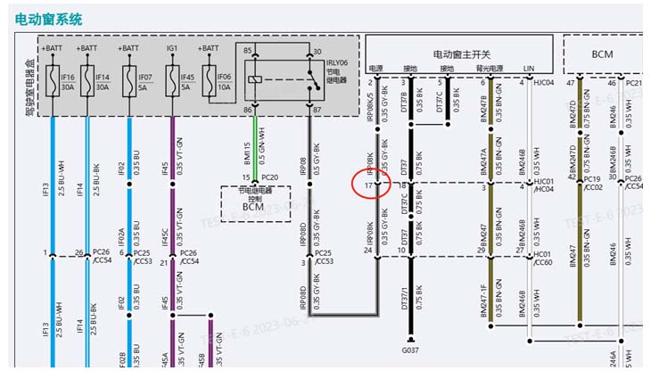2、根据故障代码查询电路图查询发现玻璃升降主开关电源线对地短路。