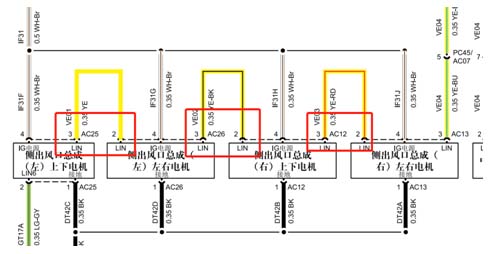 从电路图上开PC45插头是出风口扫风左右和中间风口的中间点,经过对地测量发现PC45连接左右侧出风口的LIN线对地导通,PC45连接中间出风口侧LIN线正常,因此确认为左右出风之间的连接线路存在短路(对地打铁),从而对每个左右出风口电机插头断开后分段进行接地导通测量,最终锁定为AC26-PIN3与AC12-PIN2之间存在打铁(对地短路),因此判断问仪表台内线束或者风口电机存在搭铁需拆下仪表台检测线路。\