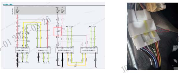 10、重新整车思路, 分析还是车辆线路故障; 用试灯测试 SRR1 电池供电 6 号脚和 IG 电源 10 号脚,发现 6 号脚的供电灯光很暗, IG电源很亮,分析为 6 号脚供电线路存在虚接情况。