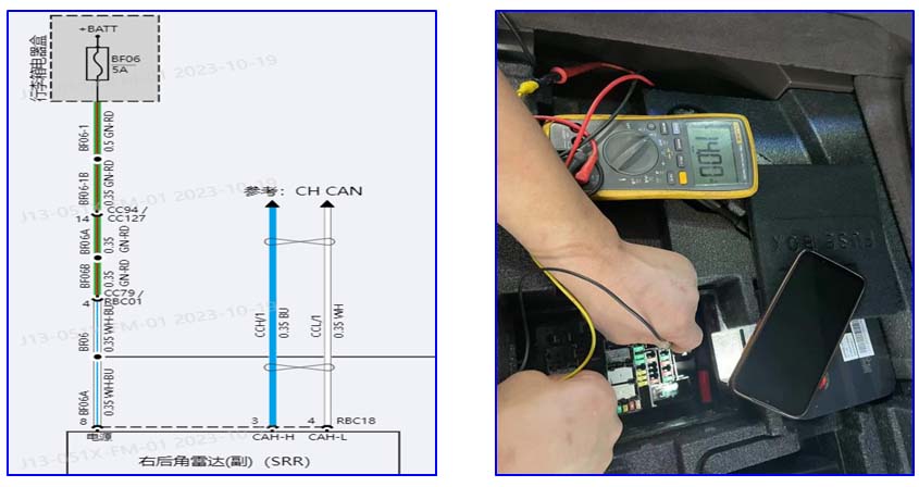 2、 根据故障码定义,查看电路图,先测量SRRR1和SRRR2模块插头的CHCAN通讯线,测量结果:终端电阻,CANH和CANL电压值都正常,CANH和CANL也没有对地短路和对电源短路