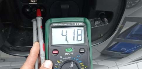2. 介于仪表提示的故障和该故障提示逻辑,用万用表量取慢充口CC对PE的电压,发现只有4,18V(正产车辆5V),判断有地方的线路问题造成了CC线电压分压