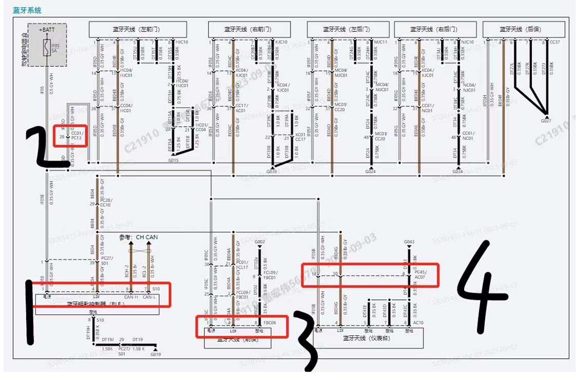 4.查看蓝牙系统电路,发现(如下图)拔下图中4个节点插头可以更快锁定故障区域。根据由简到难方法,1)拔掉蓝牙钥匙控制器插头,故障依旧。2)拔掉各车门蓝牙天线总插头CC01/PC13,故障依旧。3)拔掉前保蓝牙天线插头,故障依旧。4)拔掉仪表线束插头PC45/AC07,故障消失。故障锁定在了仪表台蓝牙天线及其线束上。
