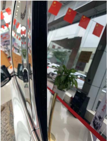 故障现象:该车为海南佳致店内展车,左侧的B柱立柱扣板可以目视到明显的弯曲变形现象。