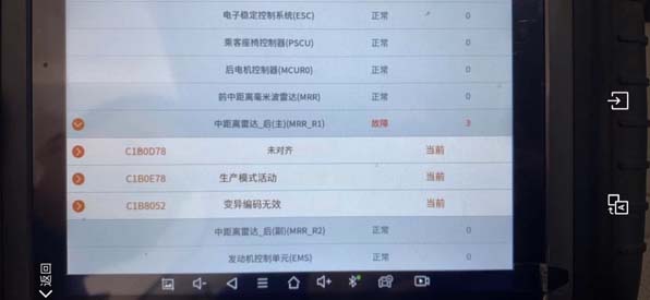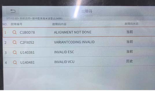 6、注意到更换前部MRR 之后也有类似故障码,是英文的。但操作方法是一样的。故障码如下图: