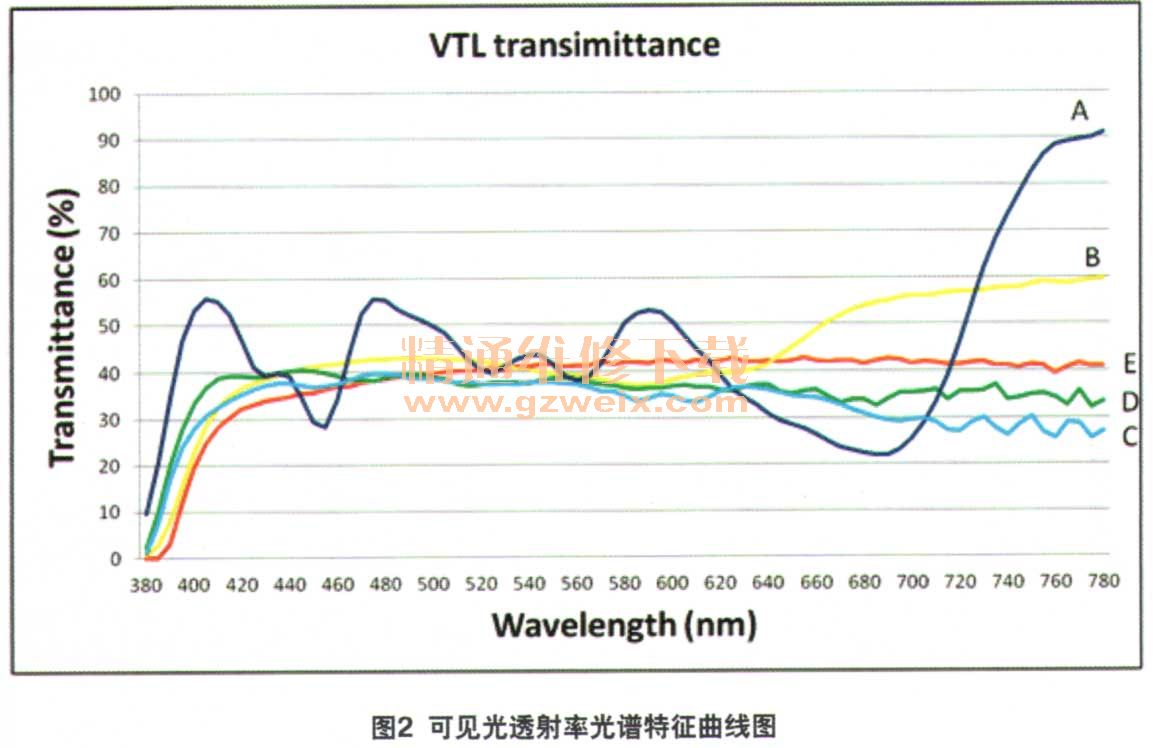 图2是5款隔热防爆膜产品的可见光透射率光谱特征曲线图,由于测试样品在选择之初就希望对比透光率(可见光透射率)接近的产品,因此选择的这5款膜的平均透光率均在40%左右。分析如下。