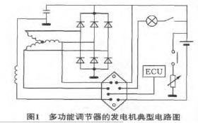 单功能电子调节式发电机, 输出电压的控制是其最基本的功能。 目前普遍应用在国内的汽车上。 例如: 北京现代全系使用汉拿JFZ1929发电机, 奇瑞旗云、 风云、 开瑞系列汽车使用汉拿JFZ1913 发电机 , 比亚迪 F3 使用汉拿 JFZ1825 发电机, 桑塔纳、 捷达等车使用博世JFZY982发电机,这些发电机都是使用场效应管式的电子电压调节器。 随着技术的发展, 出现了以VALEO 9RC7129为代表的汽车发电机多功能调节器, 它除了具备电压调节功能外, 还具有DF和FR功能。 DF为延迟功能, 即发电机软加载功能。 FR为发电机输入给ECU的负载状态信号, ECU会根据这一信号管理用电器的使用策略, 或者调整发动机的转速以适应整车电器的要求。 多功能调节器的发电机电路如图1所示, 与ECU相连的即为FR信号。 国内一些豪华车使用多功能电子调节器发电机, 如宝马全系。奇瑞也开始在A3和瑞虎上使用法雷奥9RC7129型号的多功能电子电压调节器。