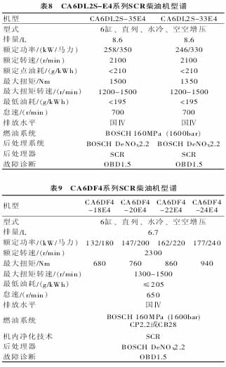CA6DF4柴油机作为6DF3柴油机的低成本升级产品, 主要用于9~11m客车和轻、 中重型载货汽车的动力配套需求。 只采用SCR技术路线, 其型谱见表9。