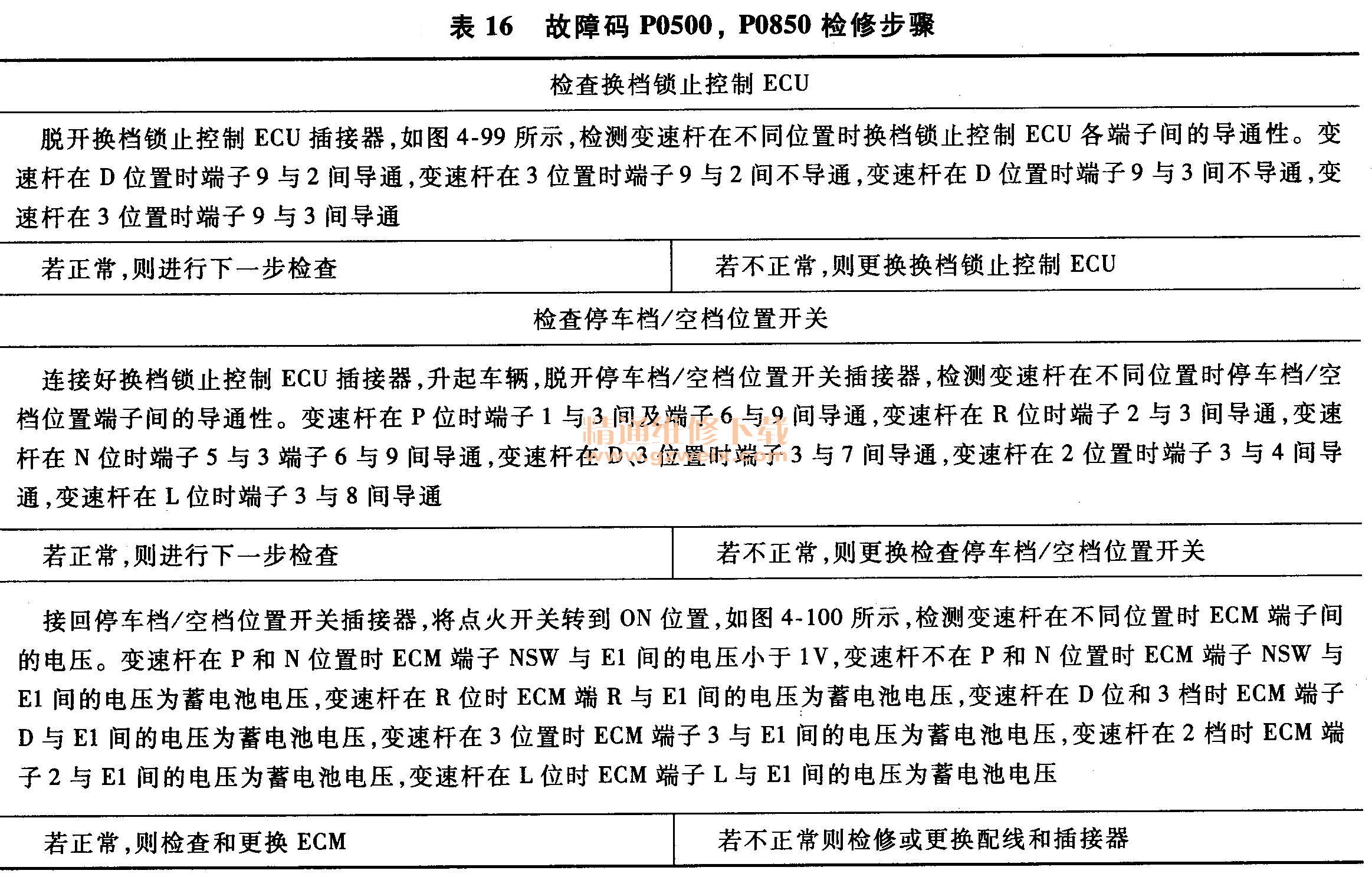 (1)故障码P0705、P0850检修故障码P0705、P0850检修电路见图98,检修步骤见表16。