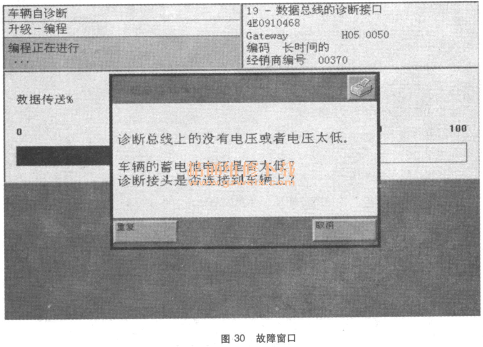 注意:如果在编程过程中出现故障窗口(如图30所示),先检查在此Flash说明中的第3点是否还要完成,然后按下重复按钮重新开始编程过程,千万不要按下取消按钮。