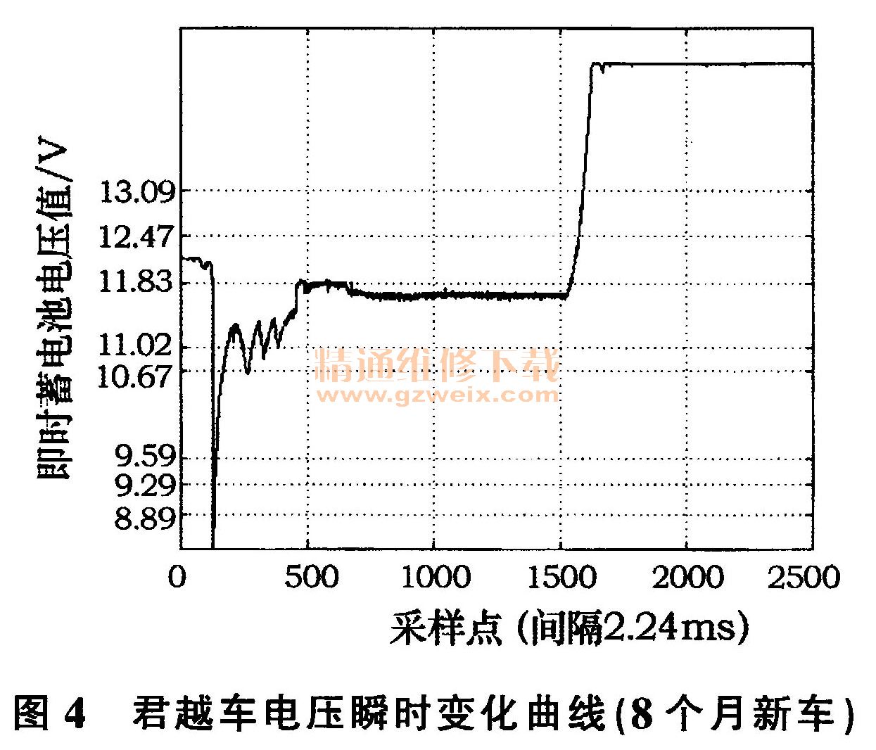 图4是一辆使用8个月的君越车的起动过程中蓄电池电压变化曲线。图4中,横轴为采样点,每点间隔时间2.24 ms,纵轴为电压值。从图4可以看到,该车蓄电池静态电压在12.1 V左右。当点火钥匙开始旋转,起动汽车的瞬间,蓄电池电压急剧下降(最低约8.5 V左右),但其持续时间非常短(小于10 ms)。当汽车起动机带动发动机完成点火后,蓄电池电压基本恢复正常,其整个起动过程不到1 s。在约3.36s后(图中1500个采样点后),汽车发电机开始工作,并开始为蓄电池充电,蓄电池电压上升到14V左右。