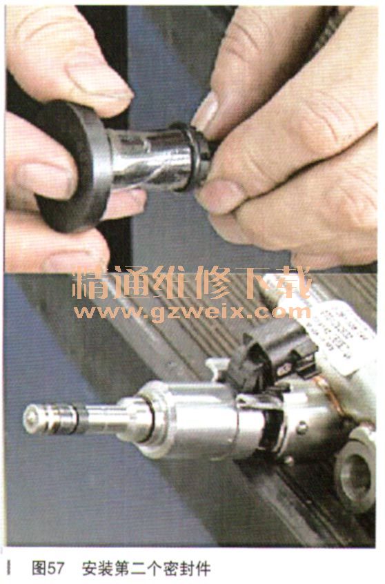 (3)只要拆下油轨,就必须更换喷油器的特氟龙密封圈。应先清除旧的密封件并清理喷油器头部,然后安装新的密封件。