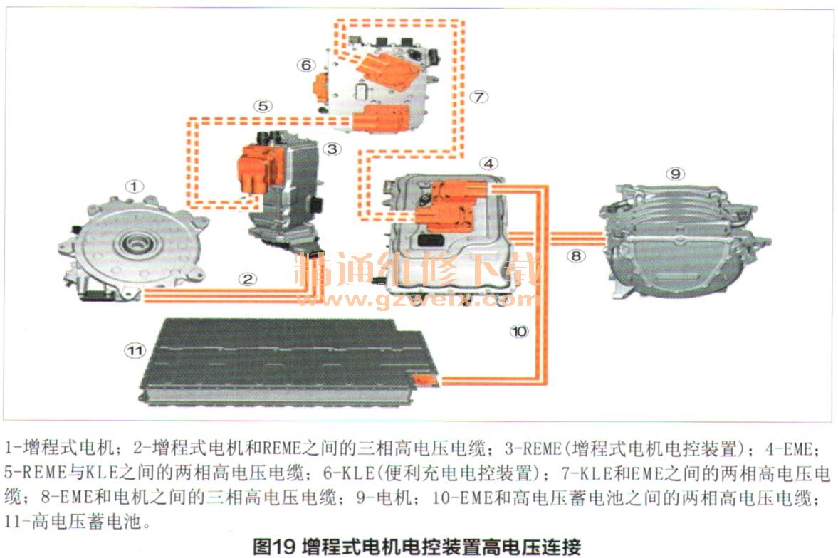 增程式电机电控装置的有两根高电压电缆,三相高电压电缆连接增程式电机,两相高电压电缆连接便利充电电控装置,如图19所示。