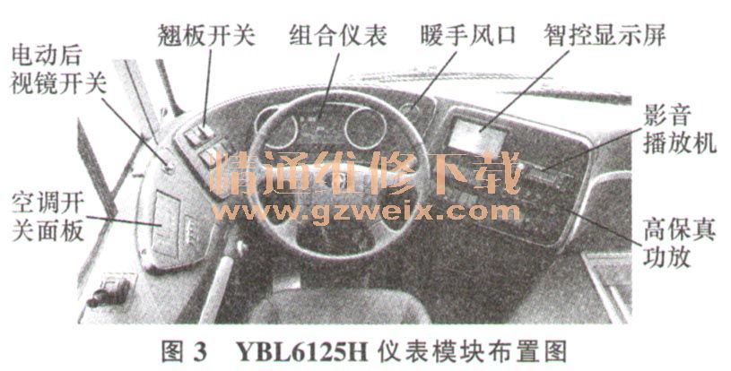 仪表模块的主要工作是仪表及开关的人机工程布置,仪表通信方案的解决及各项参数计算,仪表板线束图样绘制,仪表线束及仪表区各电器件的固定及检修方案解决,校对电器原理图中与本模块相关的内容并进行反馈,参与本模块安装及调试各项工艺文件的制定。YBL6125H仪表模块布置如图3所示。