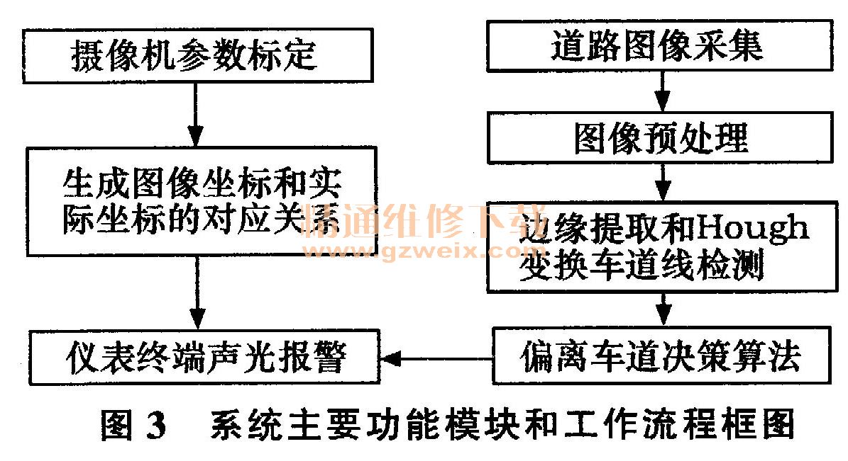 车道偏离预警系统的软件设计基于坐标系间的坐标变换原则,研究集中在道路感知和车道偏离决策两个方面,道路感知的核心是通过道路图像信息对车道线进行识别,主要是道路识别算法的研究;车道偏离决策的主要任务是根据当前车的运动状态和前方道路几何特征等信息,确定合适的预警时间。系统主要的功能模块和工作流程框图见图3。
