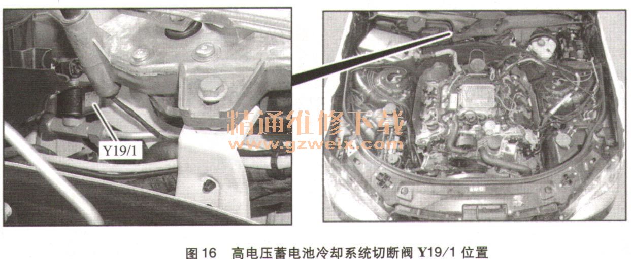 蓄电池冷却系统切断阀Y19/1位于散热器水室中(图16),由