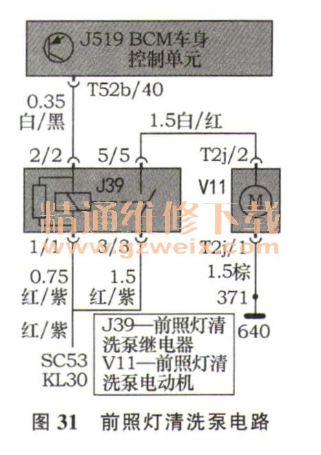 图31为前照灯清洗泵电路,常电KL30→SC53→前照灯清洗泵继电器J39线圈→J519的T52b/40端子,常态下T52b/40端子处于高电位,继电器线圈无电流流过,继电器触点打开。当J519检测到E44处于前照灯清洗档位置时,控制其T52b/40端子搭铁,继电器线圈得电常开触点闭合,从而向前照灯清洗泵电动机V11供电。
