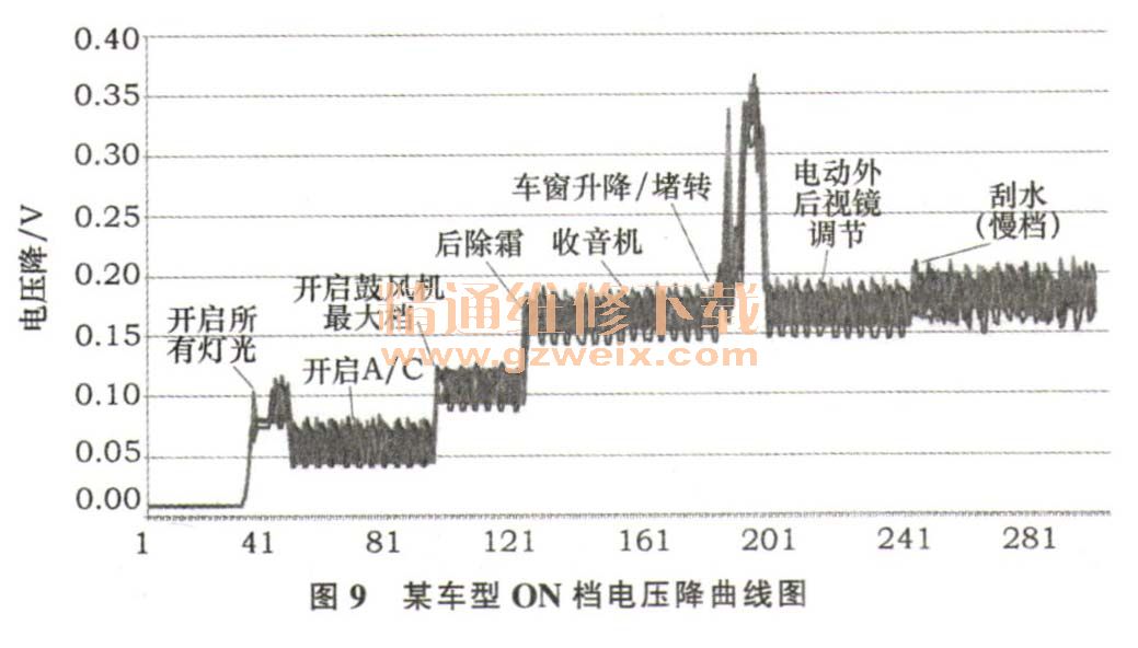 电压降变化。图9和表1所示是某车型ON档