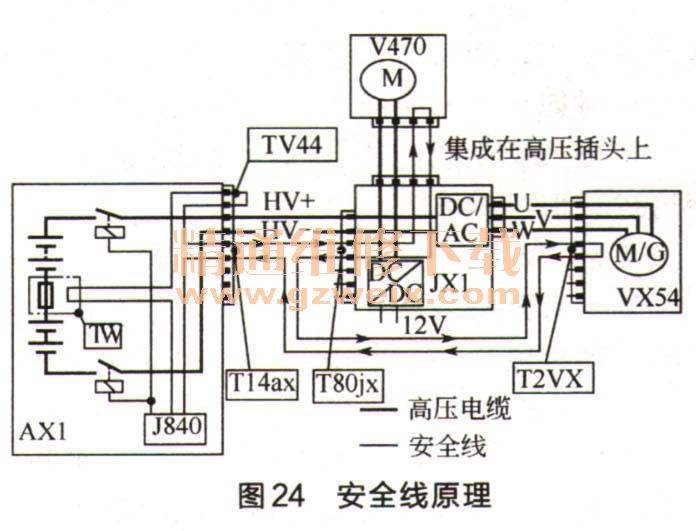 安全线是环形结构的,它穿过所有的高压部件。功率控制电子系统提供一个信号,控制单元J840会分析这个信号。如果安全线中断,那么高压触点也就脱开,于是高压系统就被关闭。在高压部件脱开或者拔掉高压线时,安全线就中断,其电路控制图、原理如图23、图24所示。它包含一个机械元件和一个电气元件,如图25所示。