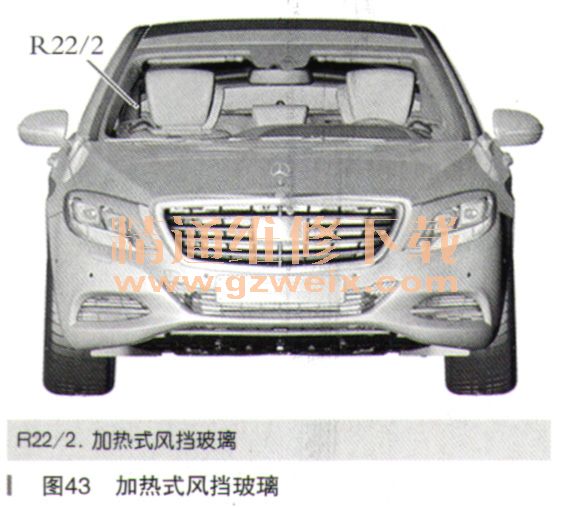 风挡玻璃加热器:为防止结冰和起雾,可加热风挡玻璃。智能气候控制单元(N22/1)控制和监视加热式风挡玻璃功能。R22/2加热式风挡玻璃如图43所示。