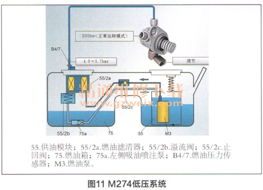 M274的燃油供应系统由低压回路和高压回路组成,低压回路提供燃油压力,经高压回路压缩至200bar(1 bar=105Pa)左右的高压后,两个回路的组成部件及相应的工作原理如下。