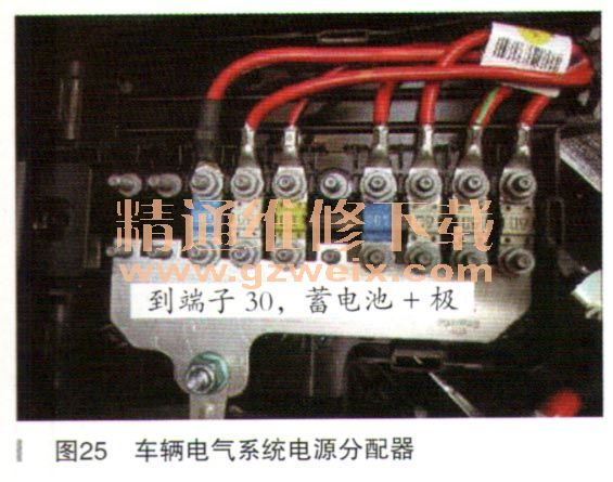 保险丝座1由箫电池断开元件(如图23所示)通过保险丝F4供电。在此可以看到更为详细的电压分配示意:车辆电气系统输出/继电器输出/保险丝座2(如图24所示)/端子15继电器,保险丝座1和电源分配器(主保险丝盒)如图25所示,位于行李箱内沿行驶方向的蓄电池左前侧。
