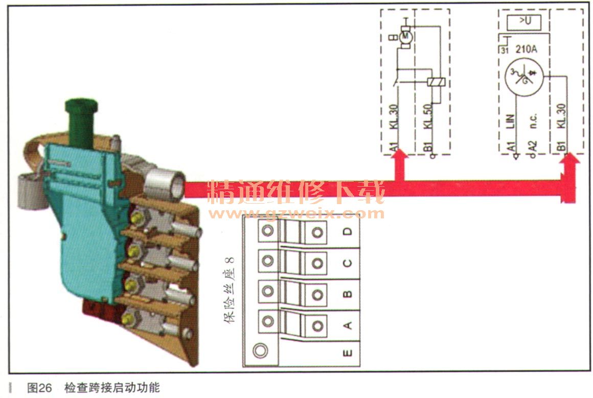 通过蓄电池断开元件中的碰撞切断组件向跨接启动连接供应电压,并且跨接启动连接如基本流程图26所示将电压分配给发动机舱内的电负荷。