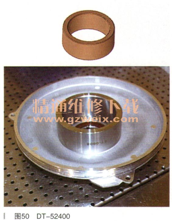 DT-52400专用工具用于在拆卸安装离合器盖油封时,支撑离合器盖(如图50所示)。DT-52399专用工具用于拆卸离合器盖油封(如图51所示)。DT-52398专用工具用于拆卸安装离合器盖油封(如图52所示)。DT-52393专用工具在安装离合器油封盖时,用干油封的导向,可以防止油封的内唇翻边损坏(如图53所示),安装时油封唇口需涂抹干净的变速器油。DT-52394专用工具用于安装离合器支座油封(如图54所示),将工具DT-52394安装在离合器支座上,旋转调节杆使上具下边缘正好在油封安装槽以上,在新油封内外涂抹干净的变速器油,并套装于工具DT-52394外围,平稳推动油封,直至装入油封槽内。DT-52395专用工具用于安装右侧半轴油封(如图55所示)。DT-52396专用土具用于安装左侧半轴油封(如图56所示)。DT-52397专用工具用于安装离合器输入端密封盖(如图57所示)。