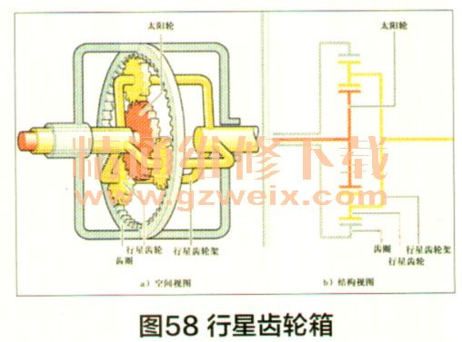 行星齿轮箱的基本特性是可以提供不同的传动比。行星齿轮箱的结构如图58所示,通过使用不同的输入和输出轴以及一个用于固定的第三轴实现不同的传动比。