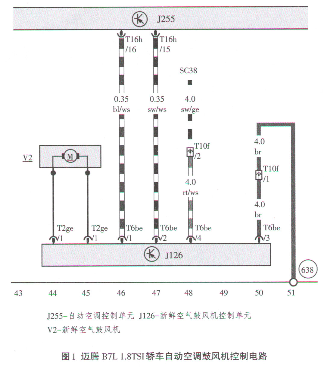 图1为迈腾B7L 1.8TSI轿车自动空调鼓风机控制电路。新鲜空气鼓风机控制单元J126上有2个插接器,分别为T2ge与T6be。