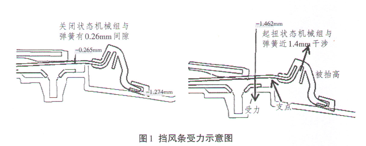 利用7颗钻石的质量分析方法,查找噪音产生的位置,确定挡风条和玻璃框架碰撞异响。在玻璃关闭状态时,无异响;天窗玻璃起翘时,敲击玻璃表面,挡风条会和玻璃干涉异响;天窗玻璃起翘状态时,用力关闭车门时,也会有异响;另外试验统计数据显示天窗玻璃框架与挡风条间隙过小达到某一特定值(0.25mm)时,关门时才产生共振异响。天窗起翘时,滑动机构主杆会挤压挡风条弹簧,但由于挡风条小夹的支撑而导致挡风条往上起翘而出现挡风条与玻璃框架间隙变小的情况而出现异响。图1为挡风条受力示意图。