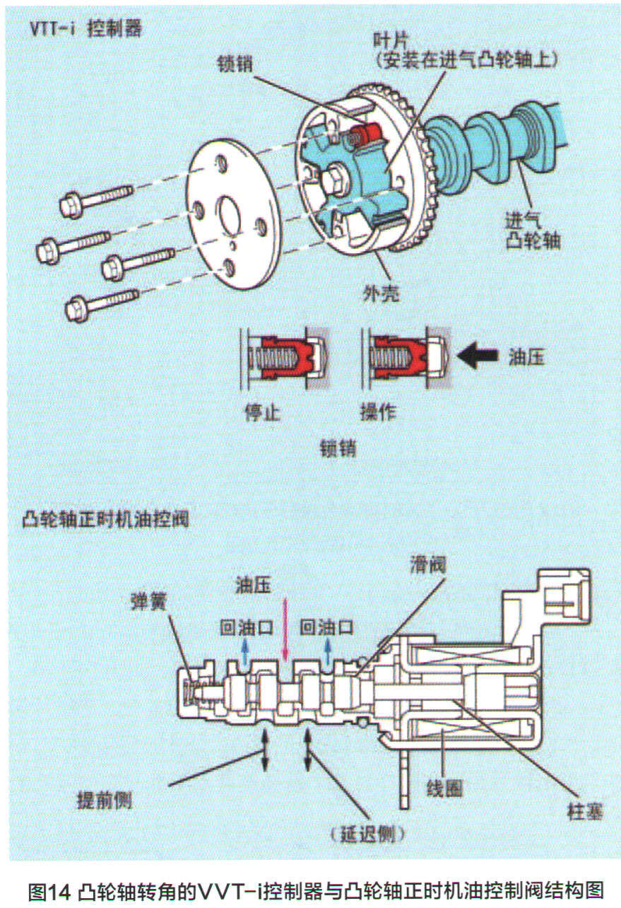 WT-i系统的构造部件包括调整进气凸轮轴转角的WT-i控制器和控制机油流向的凸轮轴正时机油控制阀,如图14所示。VVT-i控制器由定时链条驱动的外壳和固定在凸轮轴上的叶片组成。来自进气凸轮轴提前或延迟侧的通道转送的液压油使WT-i控制器的叶片沿圆周方向旋转,从而连续不断地改变进气门的配气正时。当发动机停止时,进气凸轮轴被调整(移动)到最大延迟状态以维持启动性能。在发动机起动后,油压还未立即输送的VVT-i控制器时,锁销便锁定VVT-i控制器的作动机械部件以防止撞击产生噪声。凸轮轴正时机油控制阀是接收来自发动机
