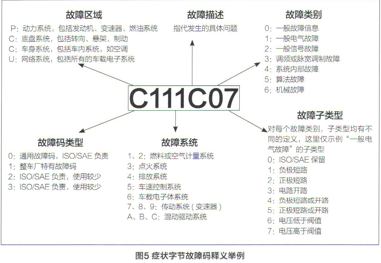 OBDII特定DTC字符序列时,有超过5 000个DTC(通用和主机厂特定)可用于指示4个车辆诊断区域之一的故障。但是主机厂已经意识到,5位DTC排列出来的有限的故障码数量,限制了故障类型的细分,并且可能会限制智能网联时代,对车辆上几百个系统进行全面诊断的能力。