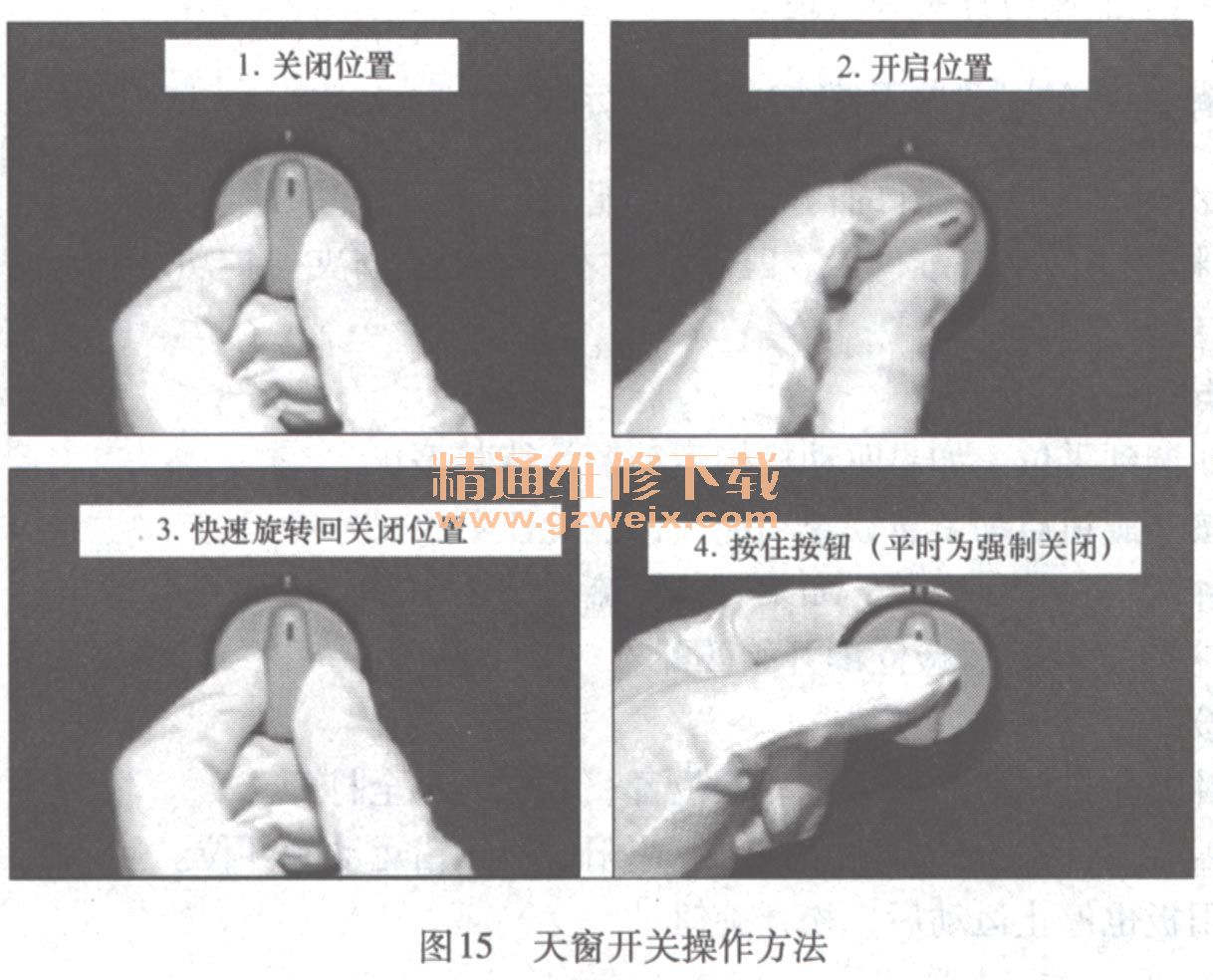 3)如图15所示,将开关由关闭位置旋向开启位置方向约15°,再迅速旋回到关闭位置,听见电动机有 “咯哒”的响声后,按住按钮,此时天窗将自动完成一个循环的运行一个自动循环完成后则表明天窗初始完成。