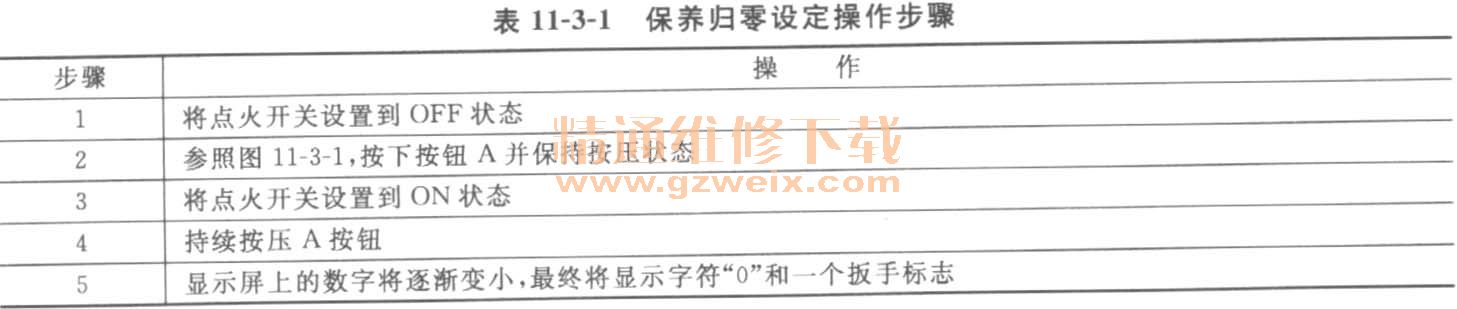 一、保养归零设定 保养归零设定参见表11-3-1。 二、电动车窗初始化设定 维护保养过程中如果断开过汽车的蓄电池,维修结束重新连接蓄电池后,要按照表11-3-2的操作步骤执行设定操作。 三、电动天窗初始化设定 维护保养过程中如果断开过汽车的蓄电池,维修结束重新连接蓄电池后,要按照表11-3-3的操作步骤执行初始化设定操作。