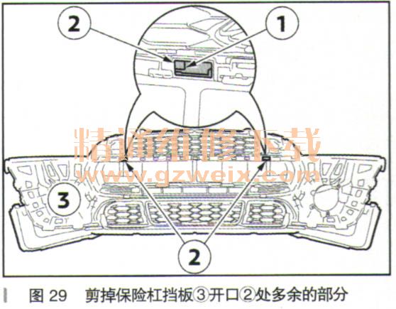 损坏危险!在处理保险杠护板③时,要更加小心。用合适的工具,剪掉保险杠挡板③开口②处多余的部分①,如图29所示。