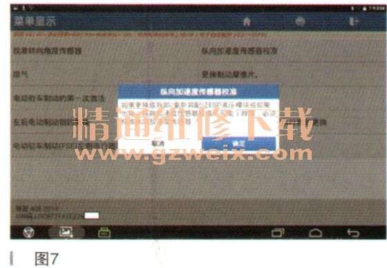 6.在更换或拆卸/重新装配过ESP液压模块,或如果出现“纵向加速度传感器校准不可能”的故障,必须校准纵向加速度传感器。点“确定”,如图7所示;