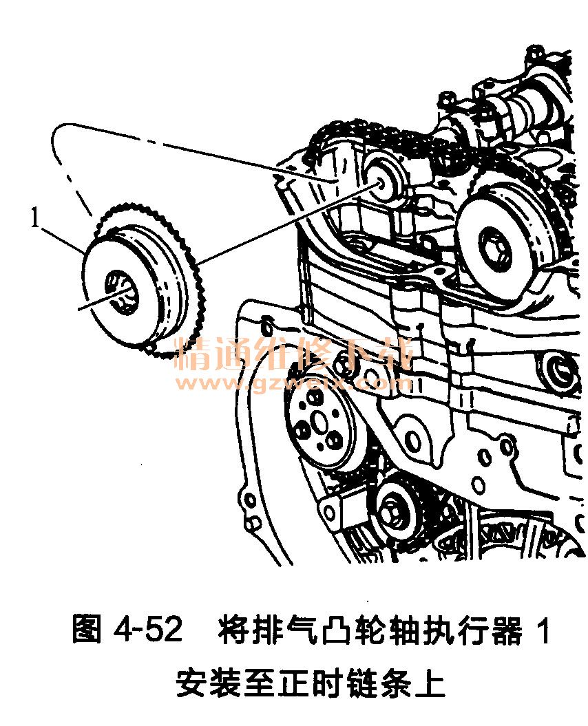 (12)正时标记对准第二节相同颜色的链节,将排气凸轮轴执行器1安装至正时链条上,如图4-52所示。