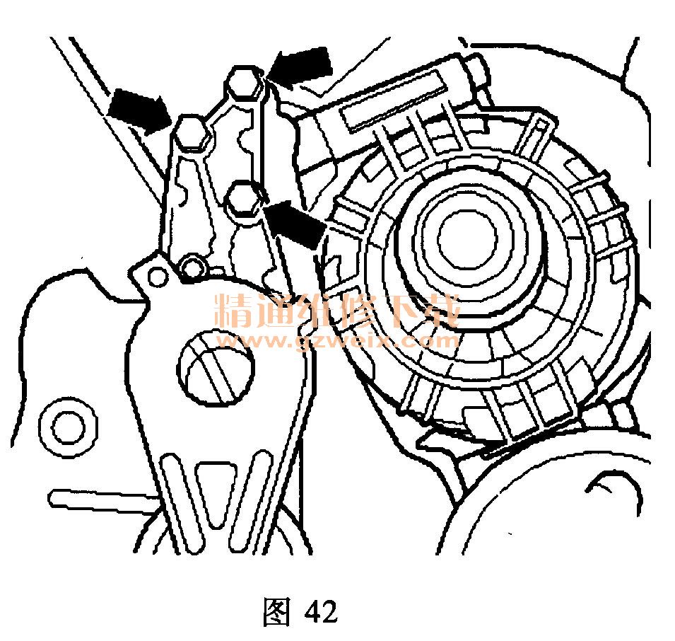 (4)旋出图42中箭头所示的螺栓并取下多楔带的张紧件。
