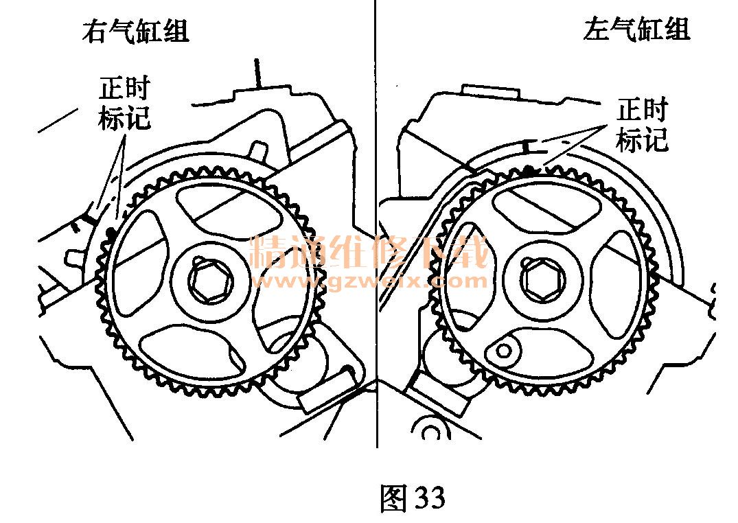 (2)将左、右气缸组凸轮轴链轮上的正时标记与气门室盖上的正时标记分别对齐.如图33所示。