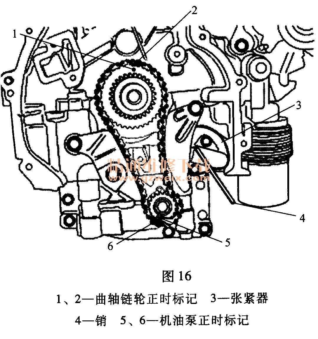 (2)安装机油泵传动链。检查机油泵正时是否正确(1对应2, 5对应6),如图16所示。