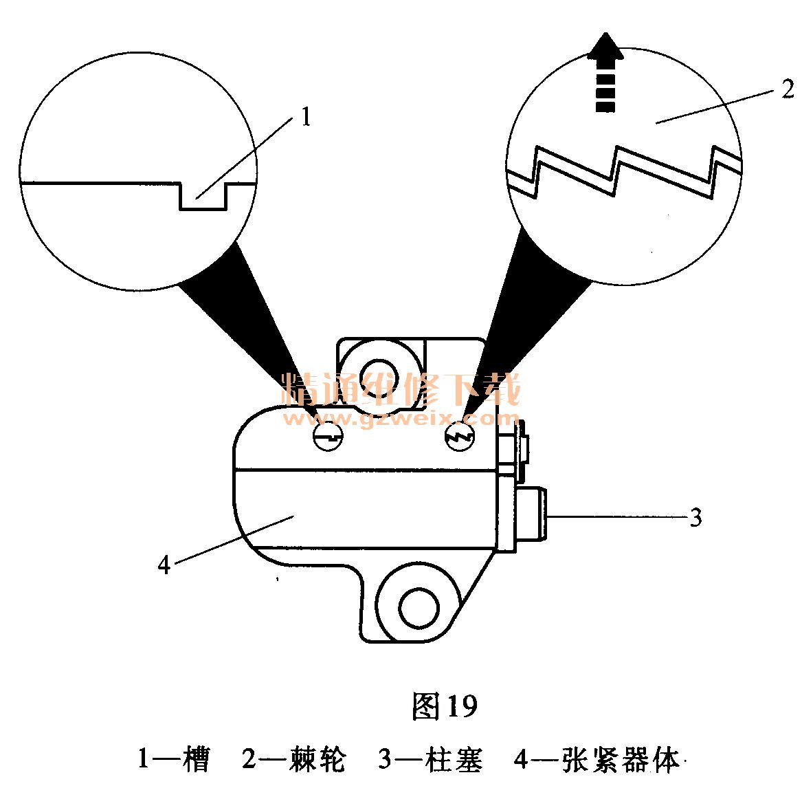 (10)向上提升棘轮2,并朝张紧器体4方向向内推柱塞3,重新设置正时链张紧器。将张紧器销插入到槽1内,保持张紧器柱塞在收缩位置内,如图19所示。