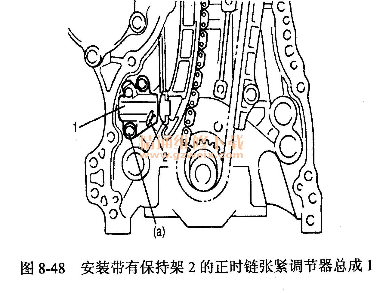 9.安装带有保持架2的正时链张紧调节器总成1,如图8-48所示。按规定力矩拧紧调节器螺栓(a),然后从正时链张紧调节器总成上卸下保持架。